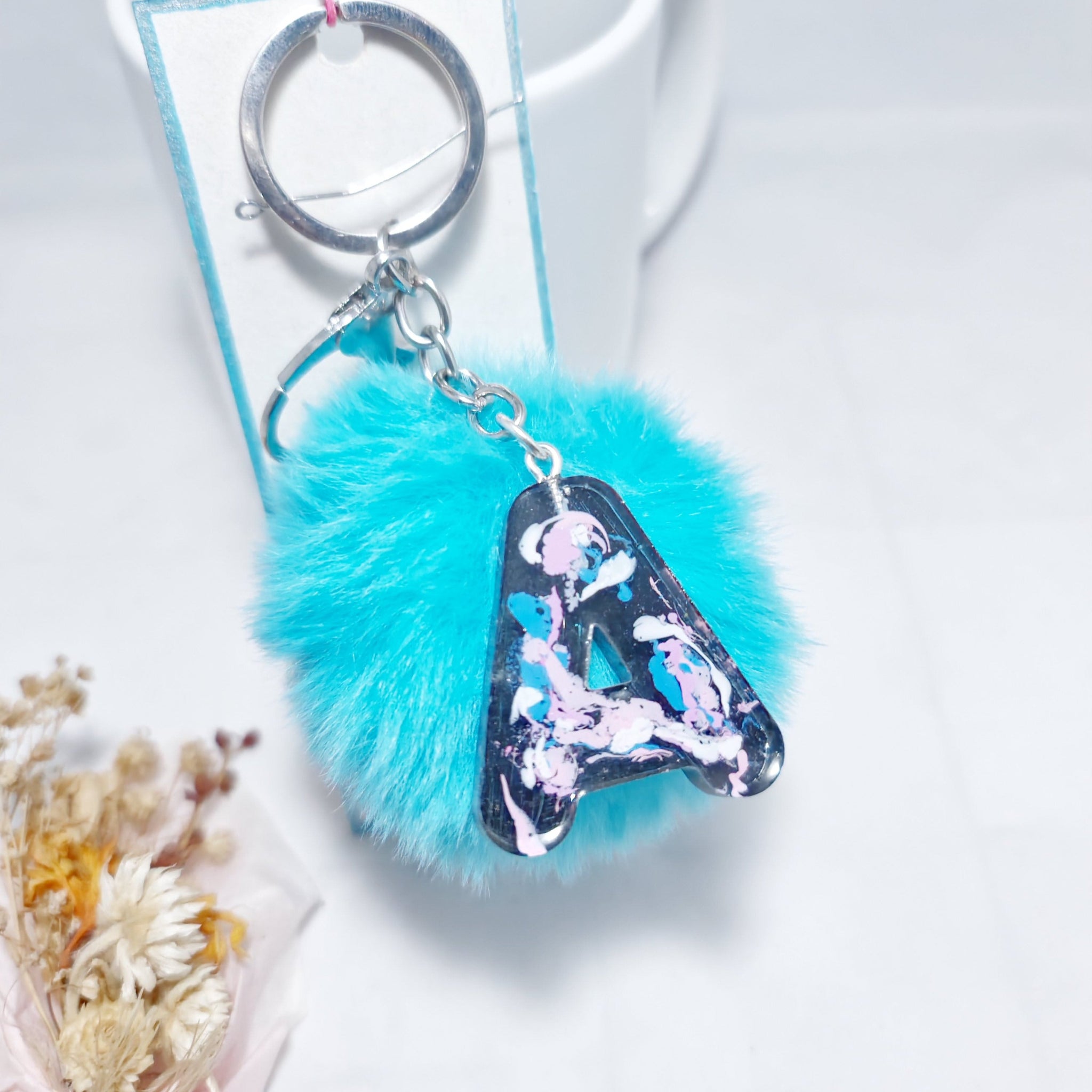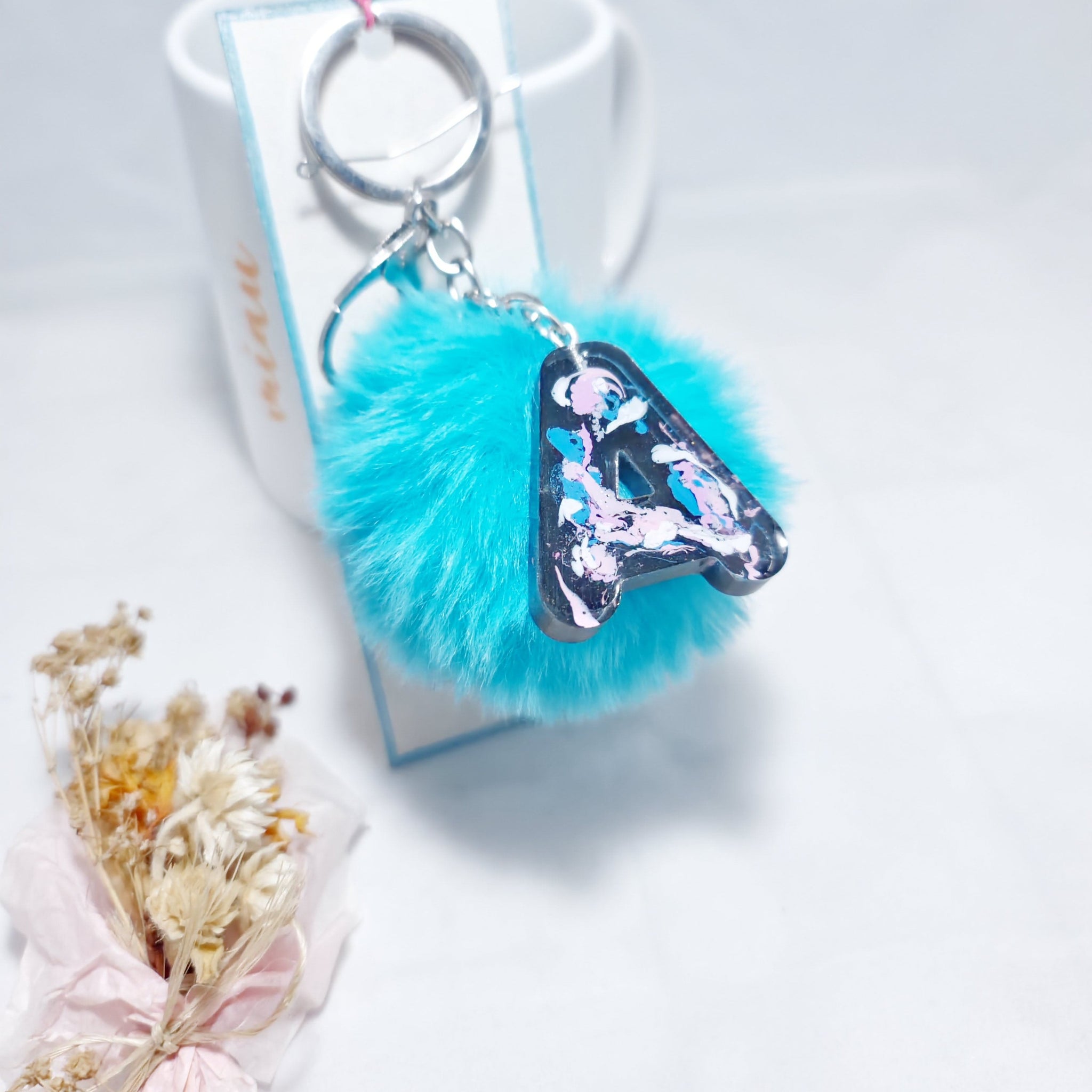 Llavero en resina, con forma de letra A fondo negro en estilo urbano y un pompón azul.  Con herraje plateado estilo pico de loro, es perfecto para tu bolso o tus llaves; para ti o para regalar, un detalle único!!