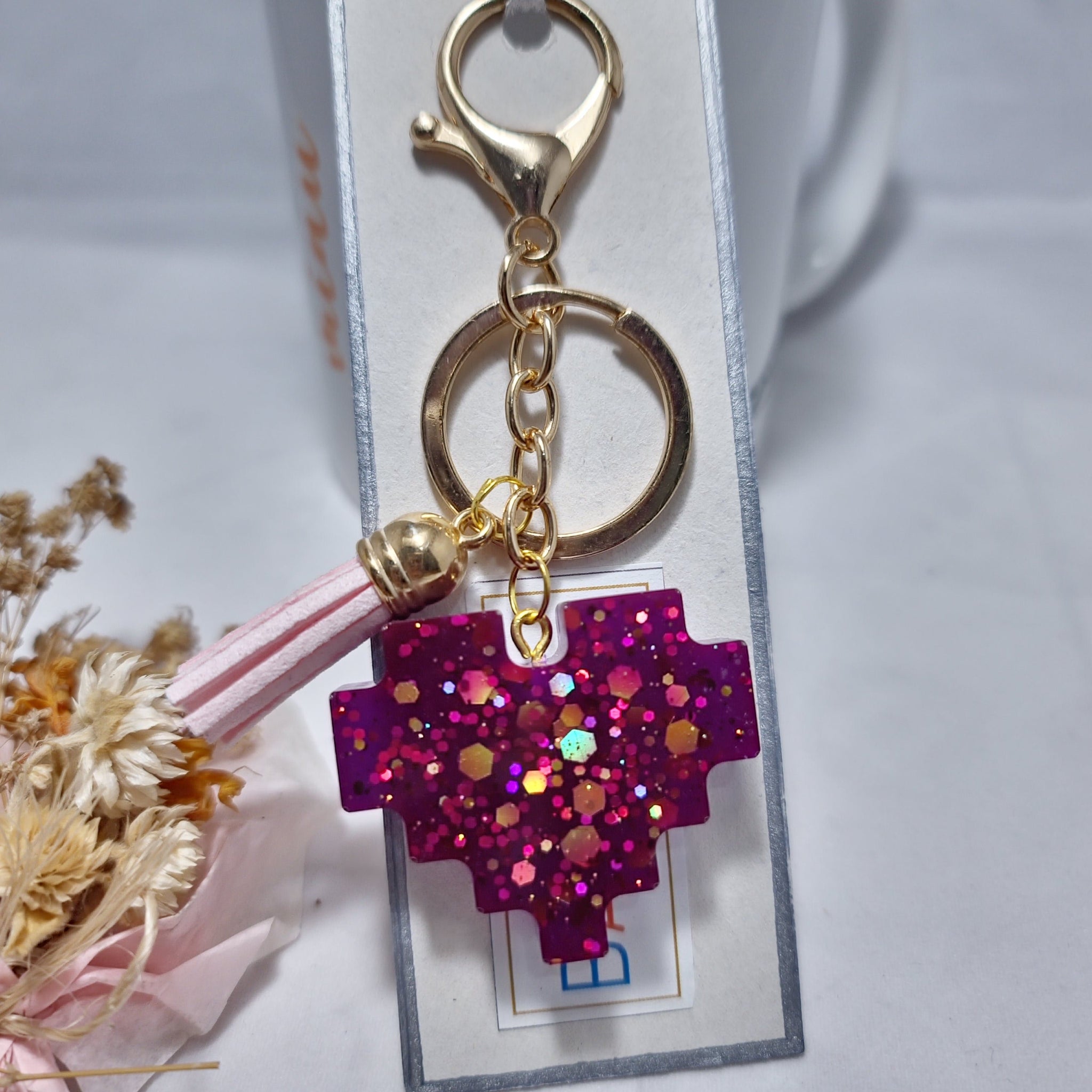 Llavero en resina, con forma de corazón, color fucsia con brillo.  Con herraje pico de loro dorado y un pompón rosa, es perfecto para tu bolso o tus llaves; para ti o para regalar, un detalle lleno de amor!!