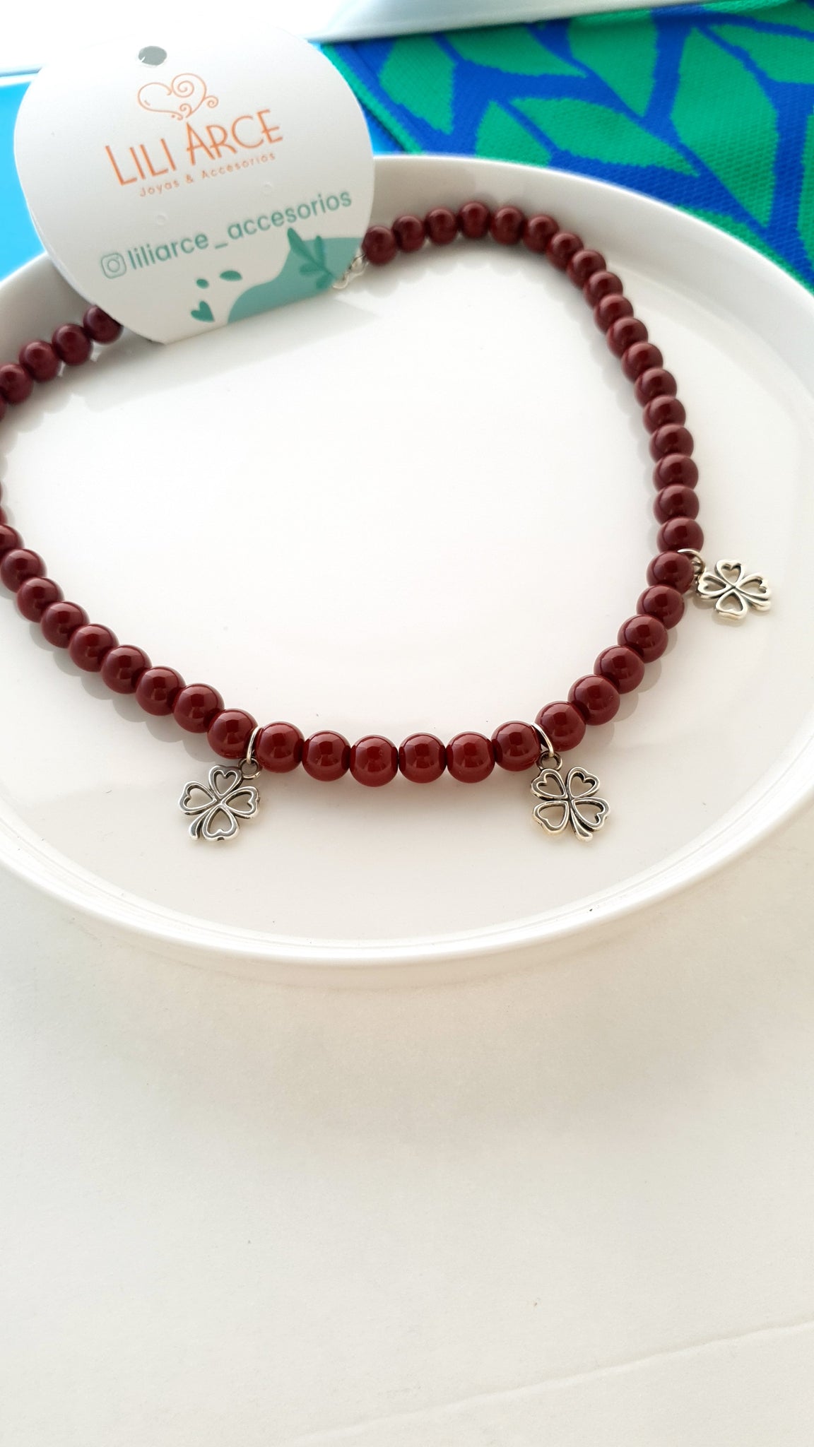 •  Collar en pepas vino con dijes de trébol envejecido.