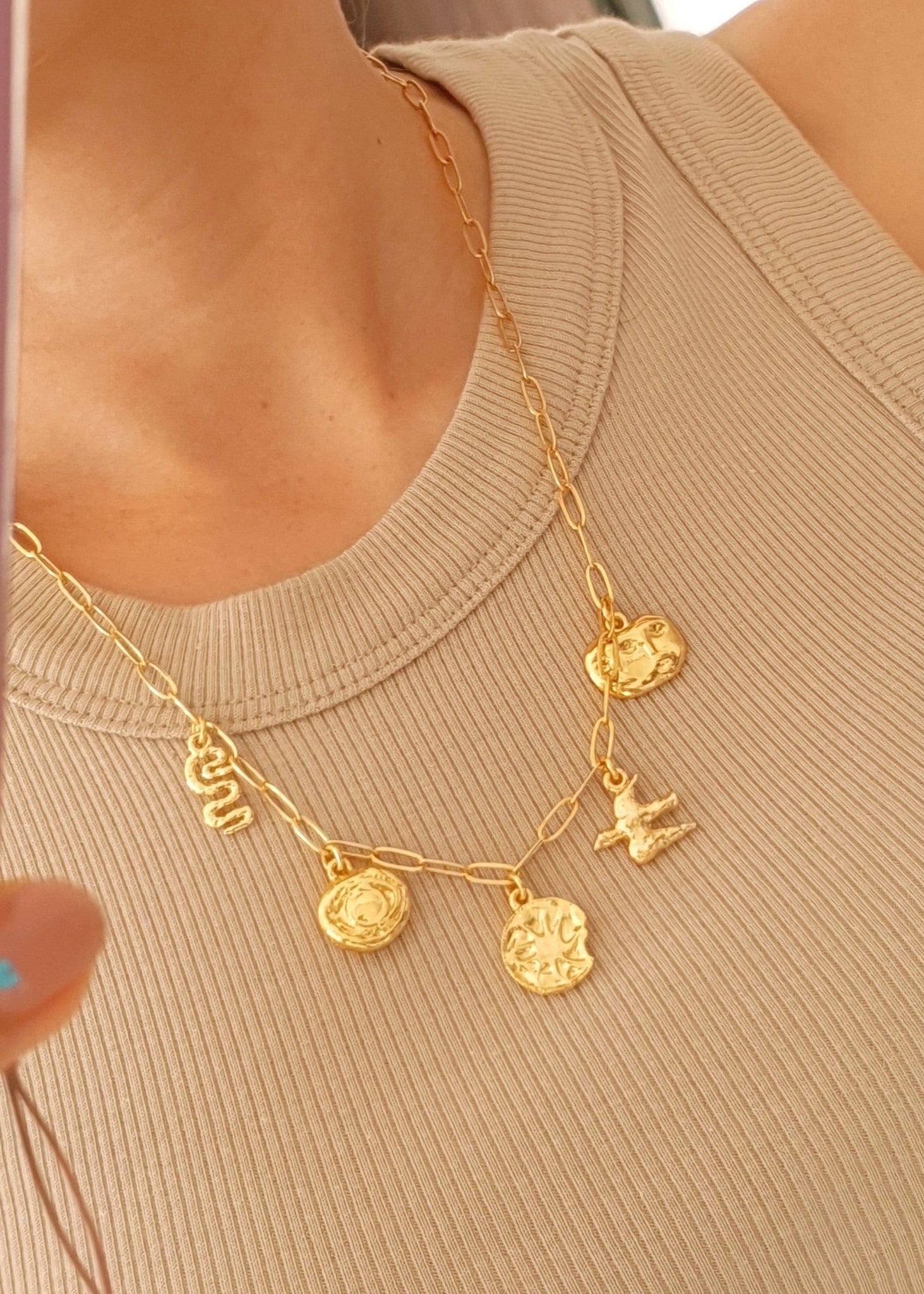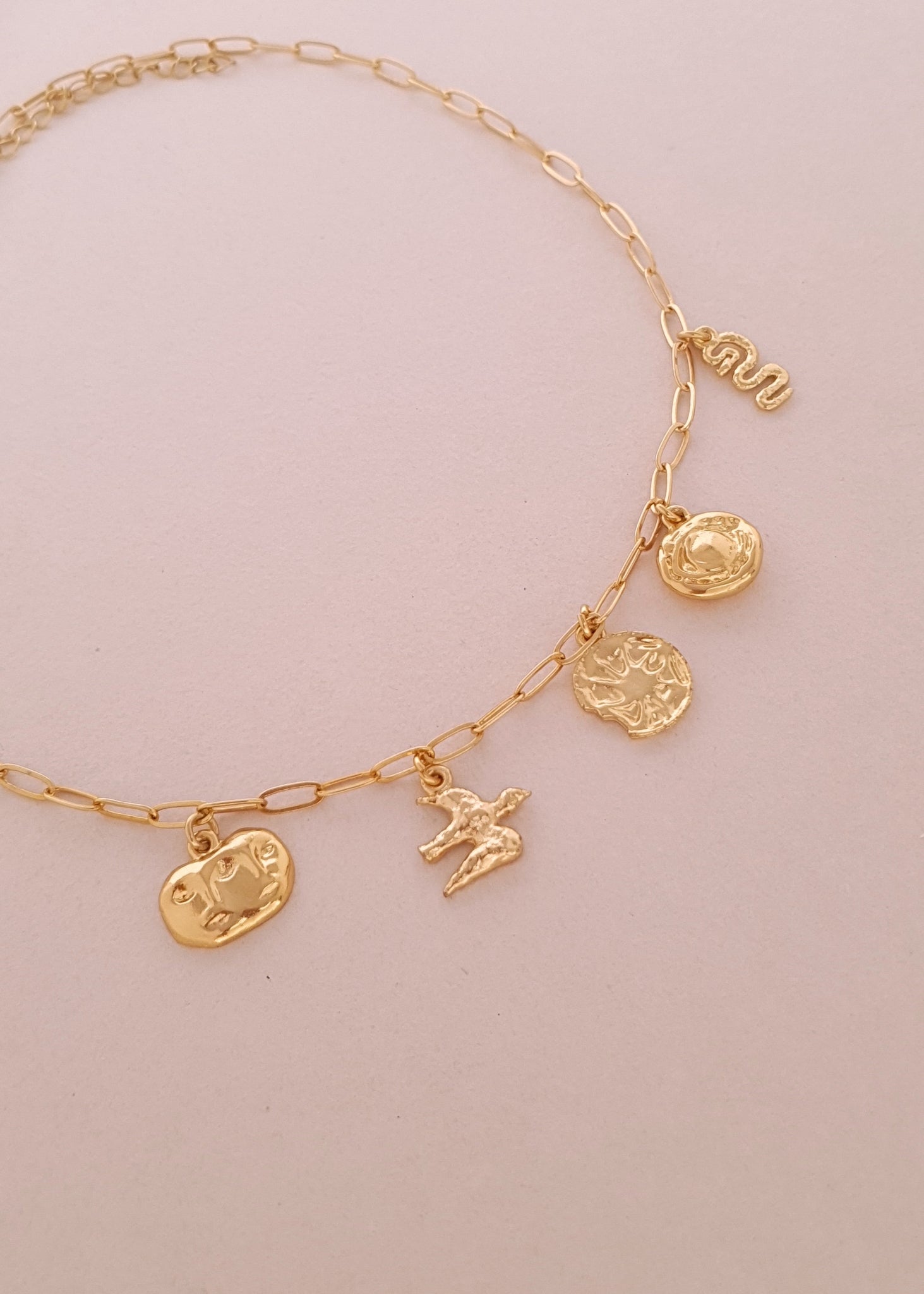 Incluye: 1 Cadena con dijes, baño de oro de 24k