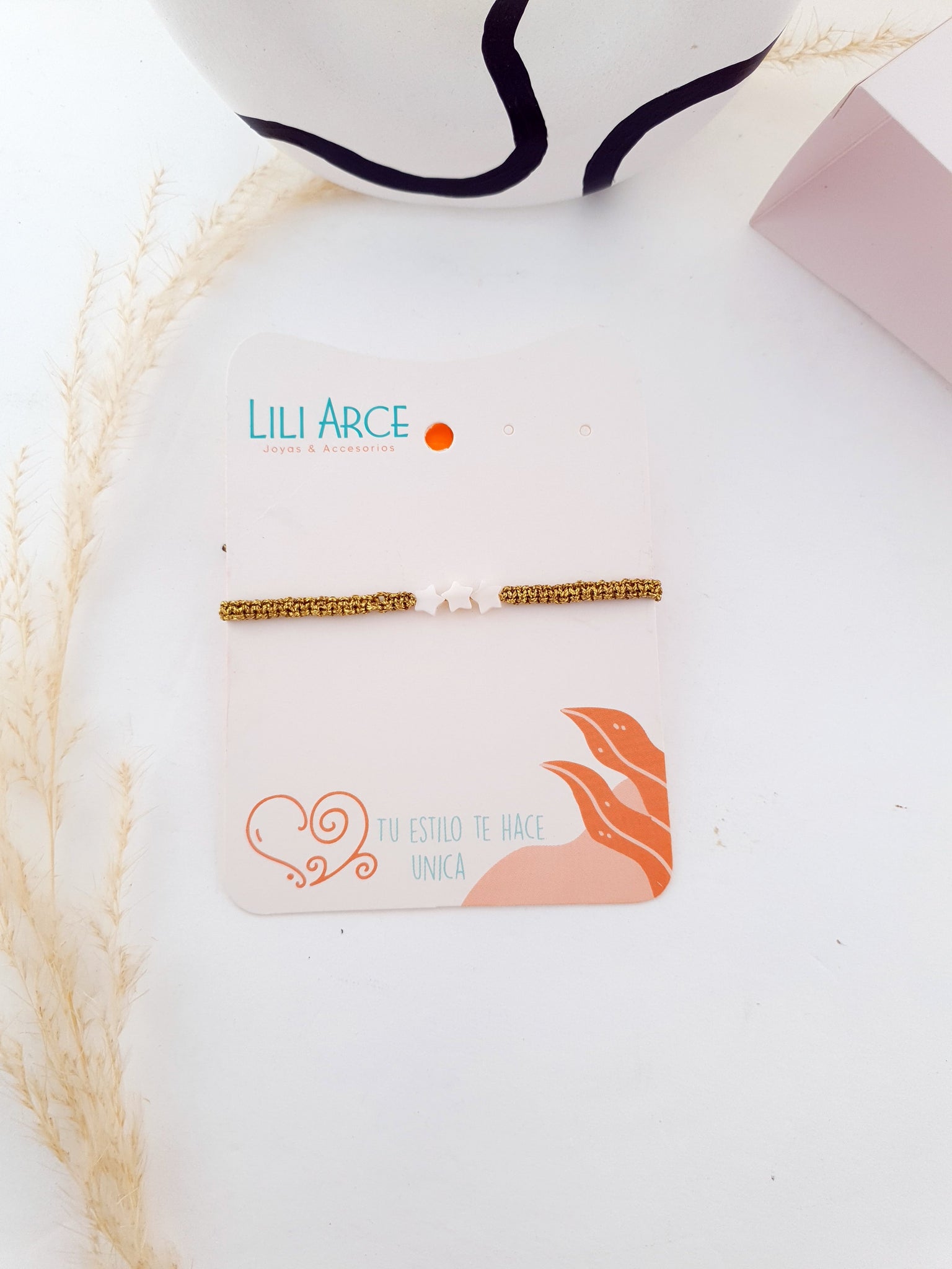 Pulsera tejida en hilo brillante con tres estrellas blancas.