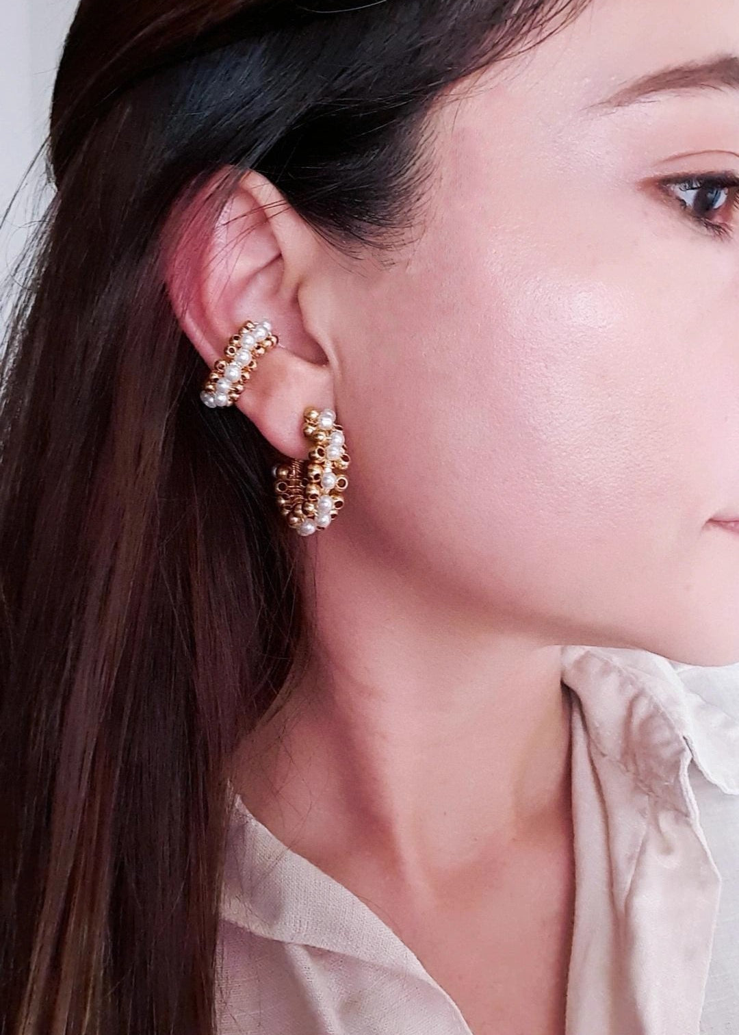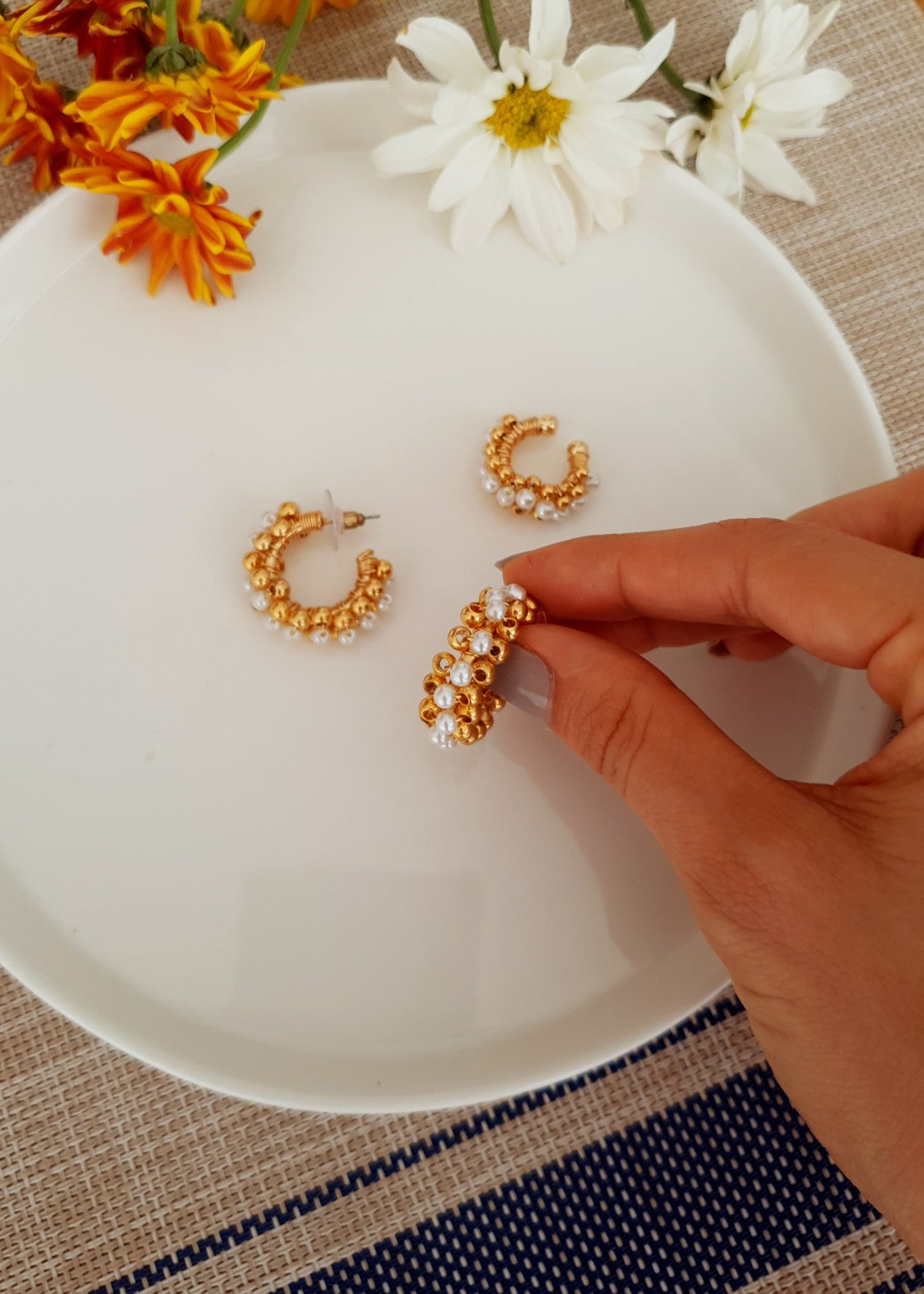 Incluye candongas e earcuff tejidos en perlas y balines con baño de oro.