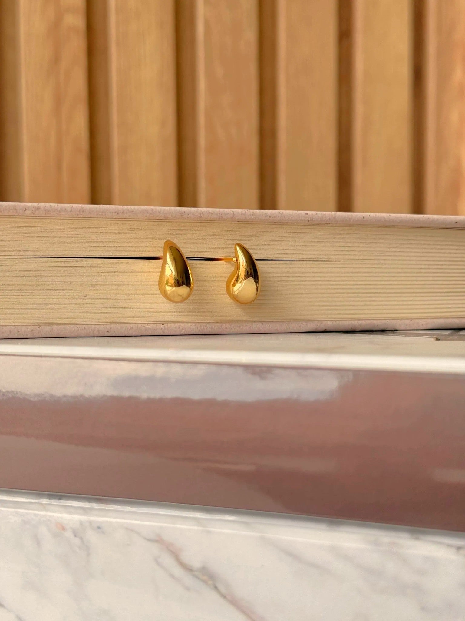 Incluye: Aretes tipo topo en forma de gota. baño de oro.